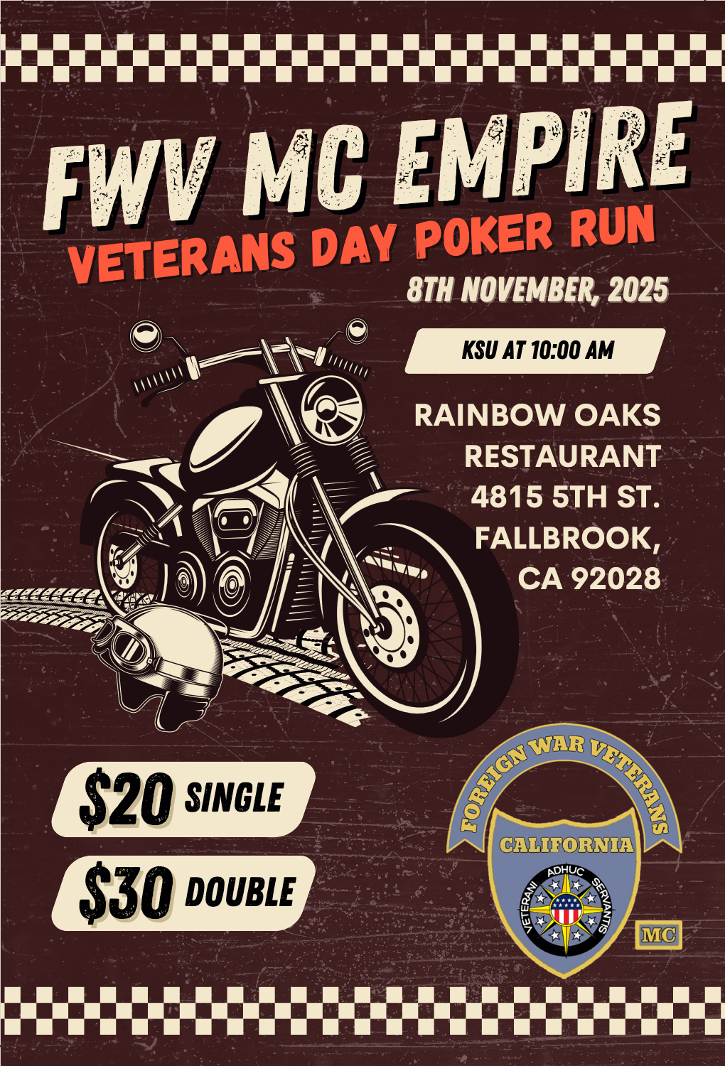 At Foreign War Veterans Motorcycle Club Empire Chapter, we host a variety of events throughout the year. From charity rides to community service projects, there’s always something happening. Check out our upcoming events and join us in supporting veterans and their families.