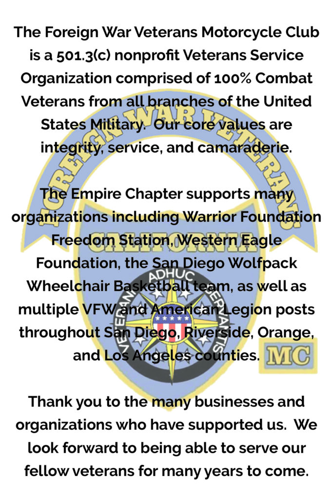 Founded in 2004 by Albert “Papa Bert” Butler, the Foreign War Veterans Motorcycle Club Empire Chapter is a registered charity with the IRS. Our mission is to aid veterans and their families, support their communities, and promote motorcycle safety and the enjoyment of riding motorcycles. All of our income goes back to helping veterans. We communicate with our clients mainly via Facebook, but occasionally through direct text messages or phone calls